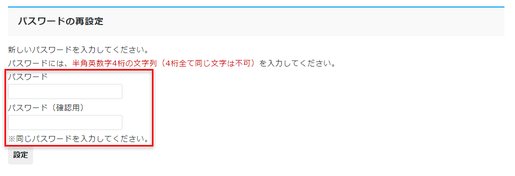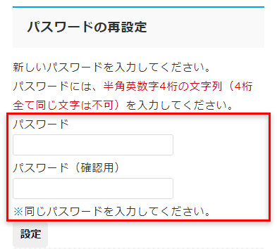 4桁の英数字のパスワードを設定してください。確認用に、設定した同じものを入力してください。